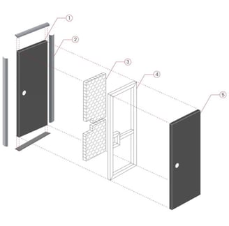 El núcleo de la puerta está compuesto por un bastidor metálico, que no solo proporciona una sólida base para la fijación de la chapa, sino que también refuerza la estructura general de la puerta. Este bastidor está complementado con un relleno de cartón, que contribuye a la ligereza de la puerta y mejora las propiedades aislantes.